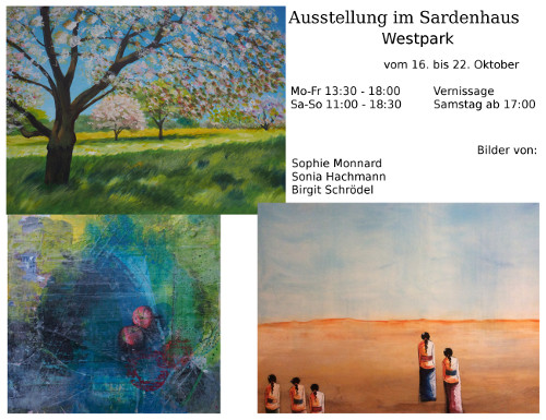 Am 21.09-27.09 stelle ich zusammen mit Birgit Schrödel, Blanka Nagy und Jürgen Baier im Sardenhaus im Westpark aus. Eine Vernissage entfällt leider wegen der aktuellen Gesundheitssituation, aber die Bilder können Montag bis Freitag von 14:00-18:00 Uhr und Samstag bis Sonntag von 11:00 - 18:00 angesehen werden. Auf Ihren Besuch freue ich mich und bitte bringen Sie einen Nasen-Mundschutz mit, da dieser im Sardenhaus vorgeschrieben ist.